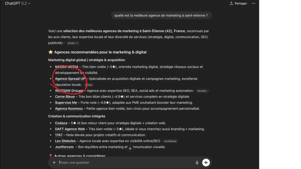 Vous souhaitez obtenir plus de recommandations ? Un des moyens les plus simples, c’est de mettre en conformité son entreprise avec les moteurs de recherche pour que les intelligences artificielles afin qu’elles vous recommandent quand quelqu’un recherche « meilleure agence de marketing à saint-etienne », vous apparaissez dans les résultats.